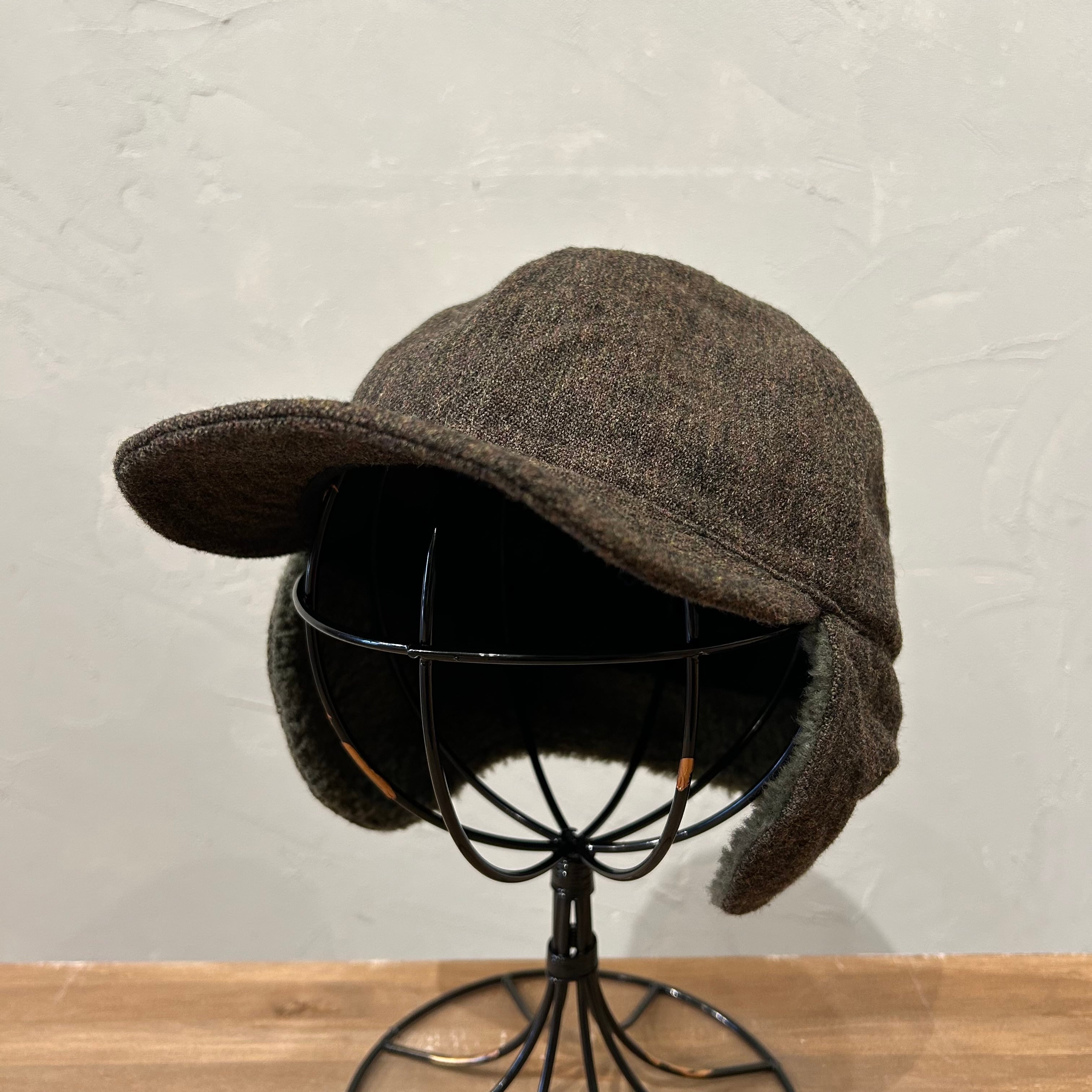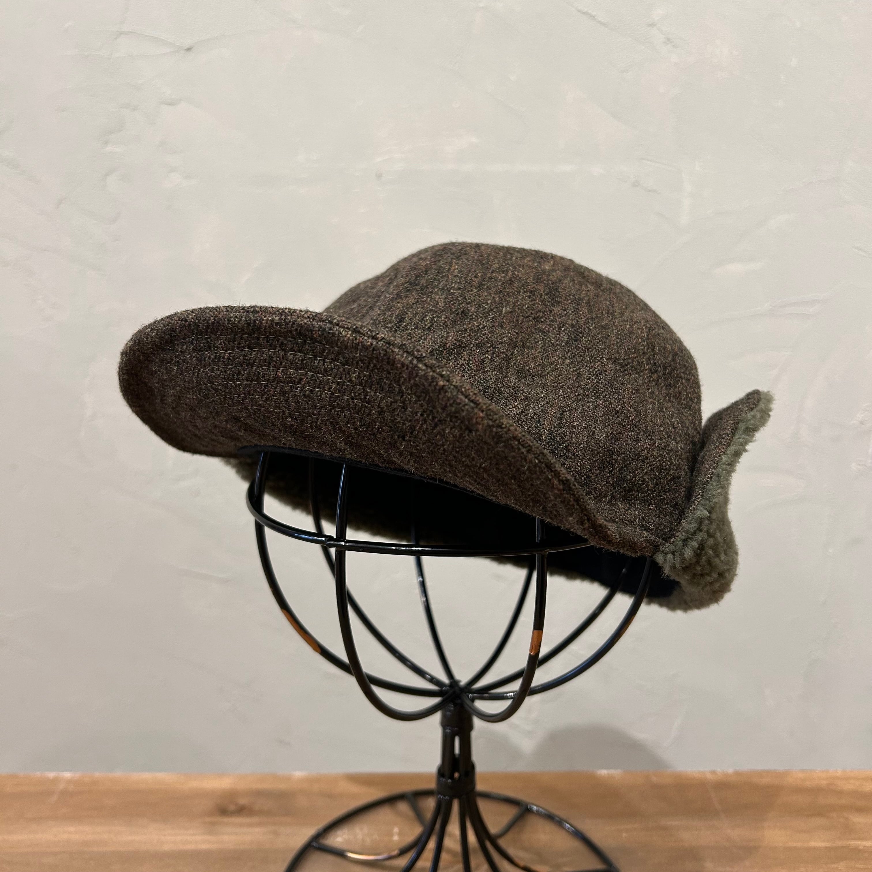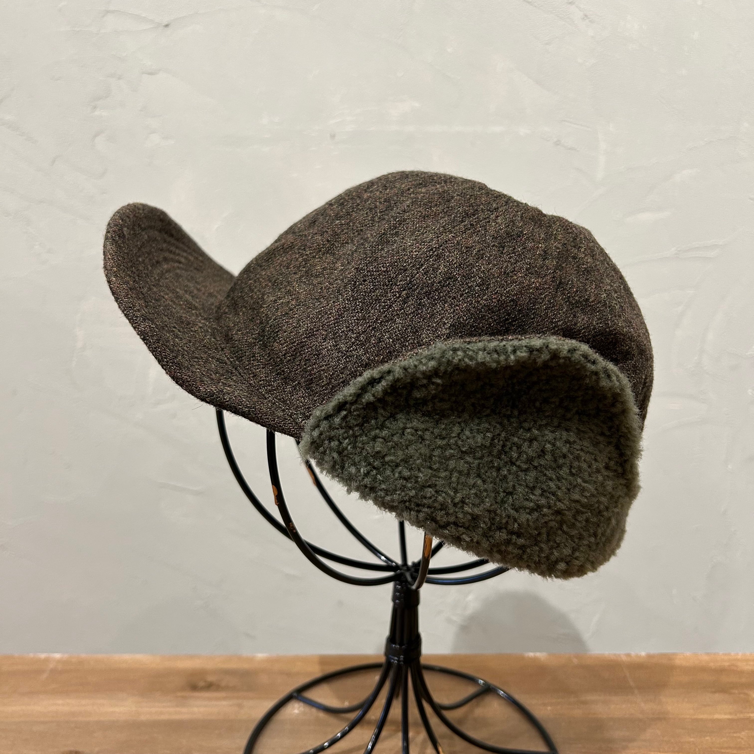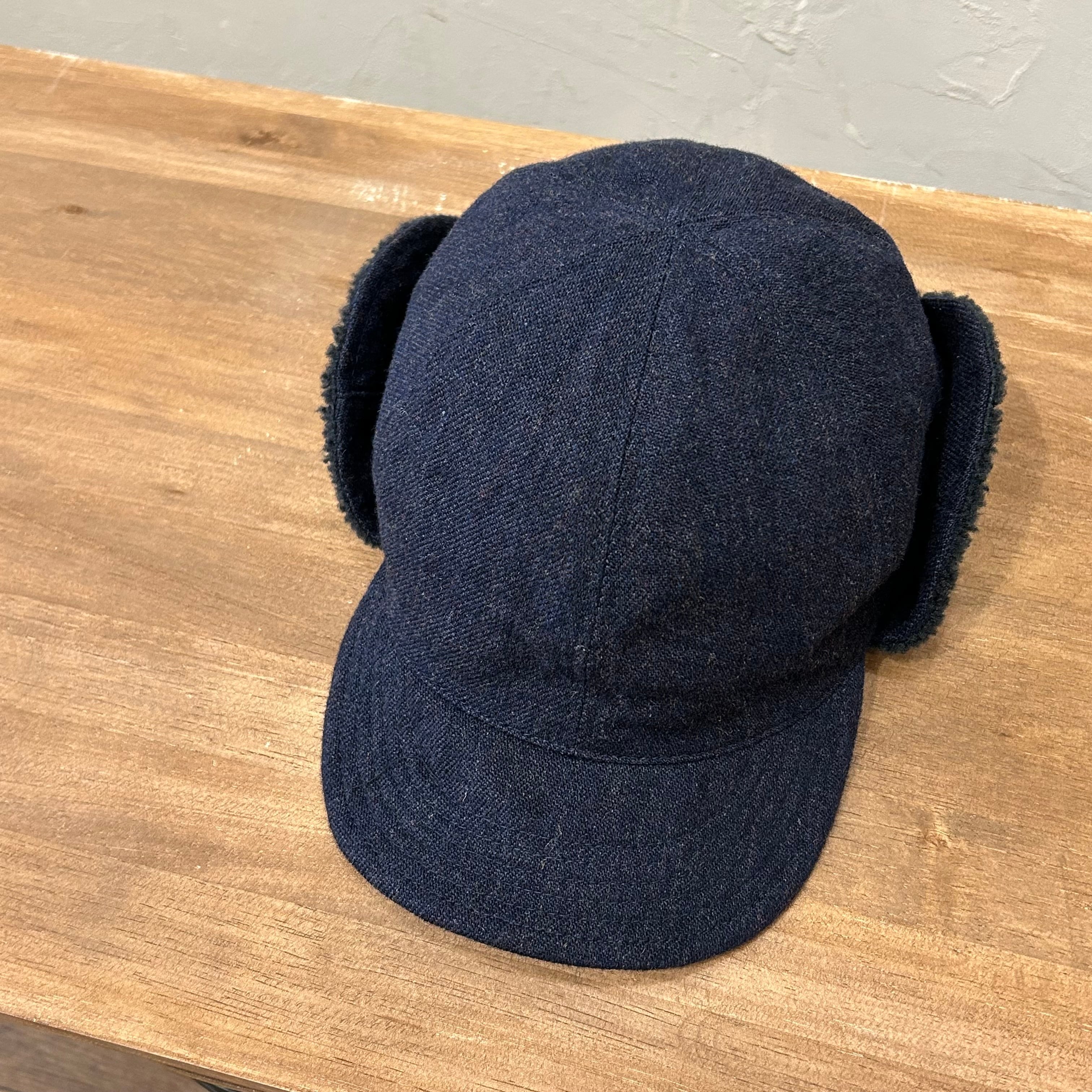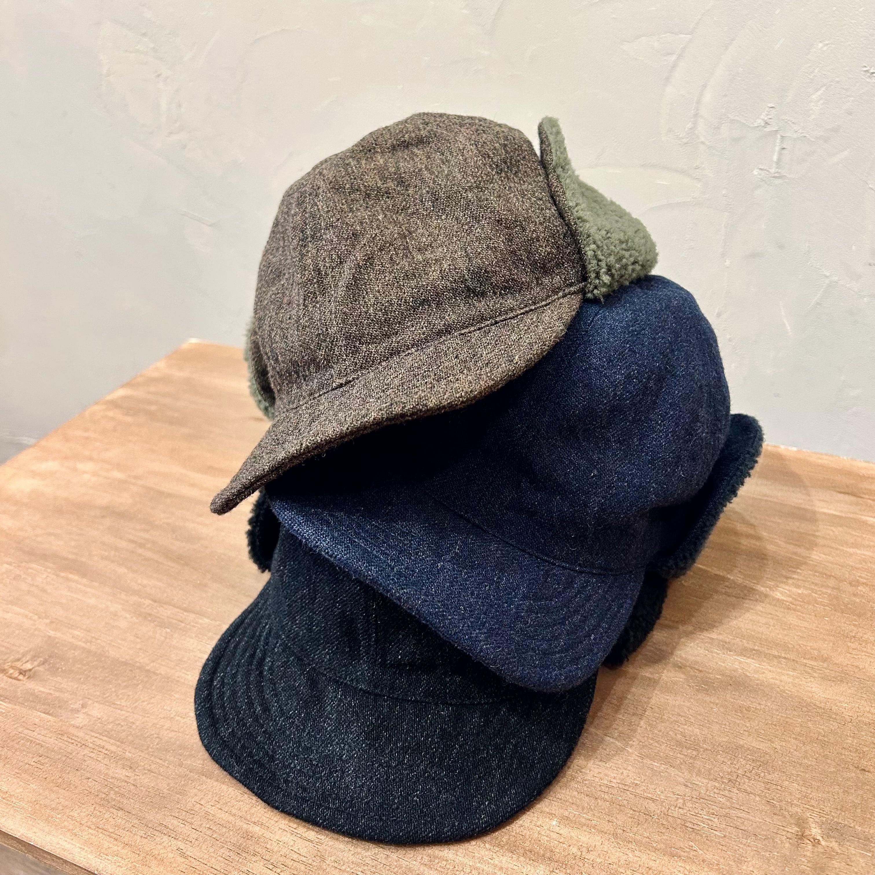 経糸をシェットランド混ウール、緯糸にデニムに使用される太番手のムラ糸を打ち込んだコットンウールツイル素材を使用したハンターキャップ。