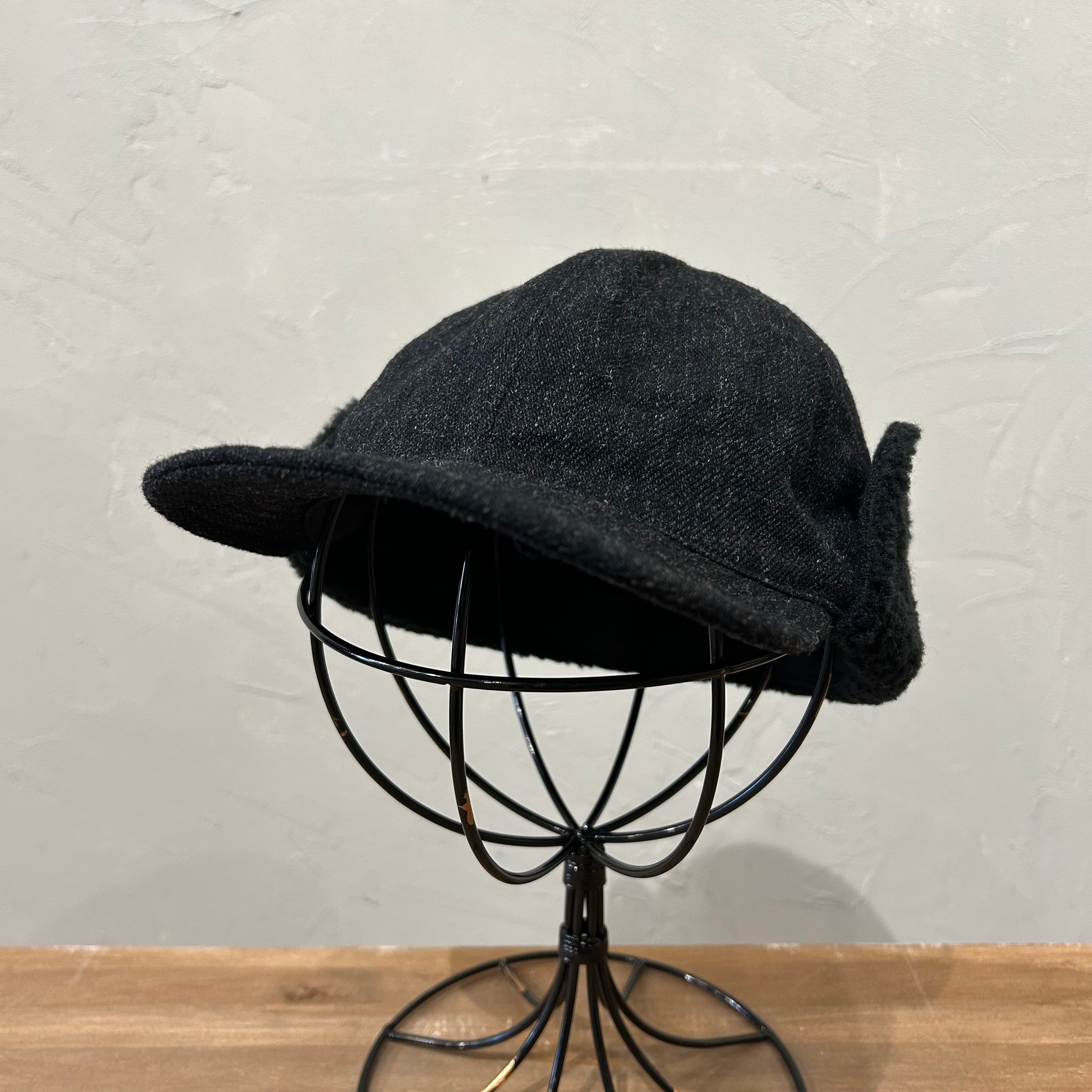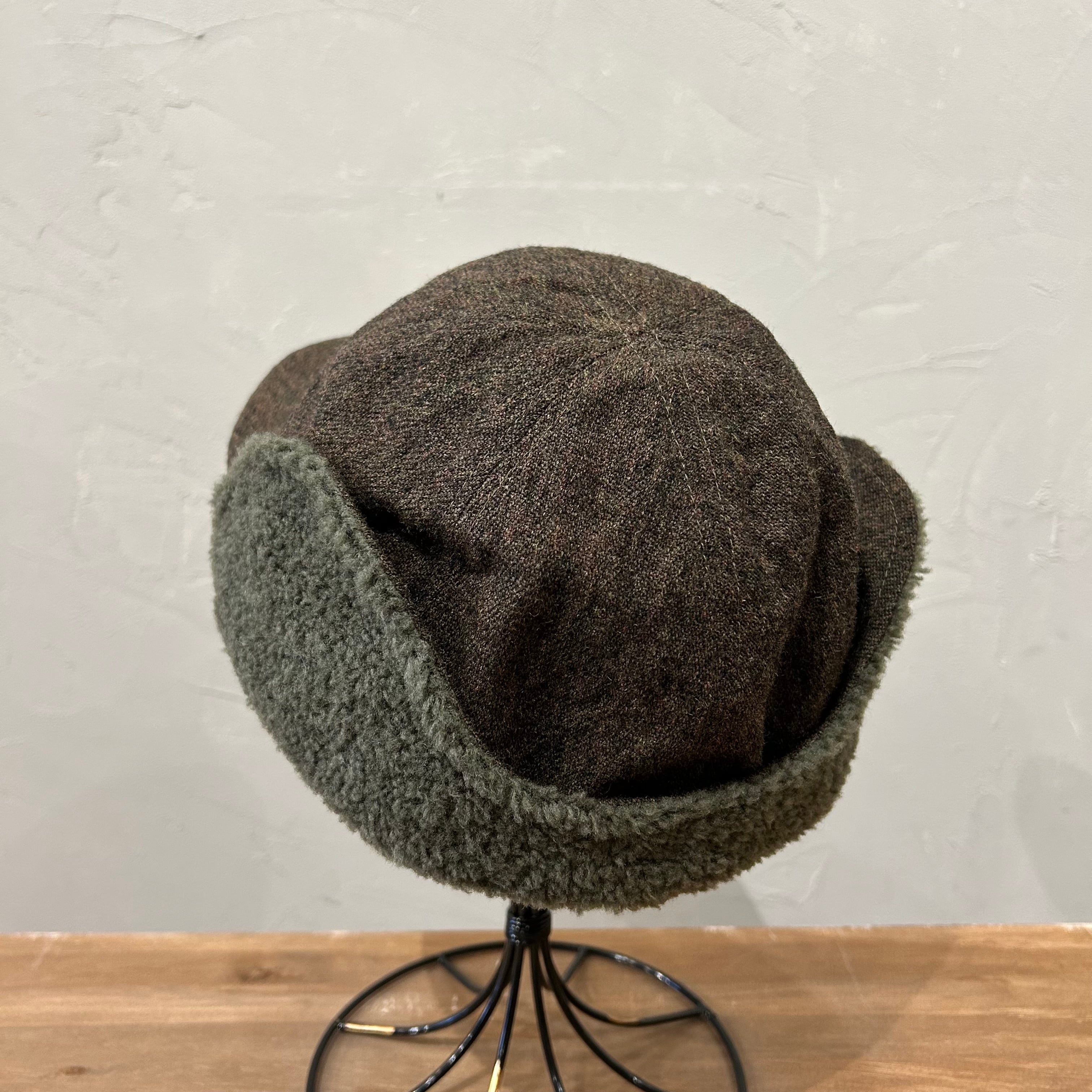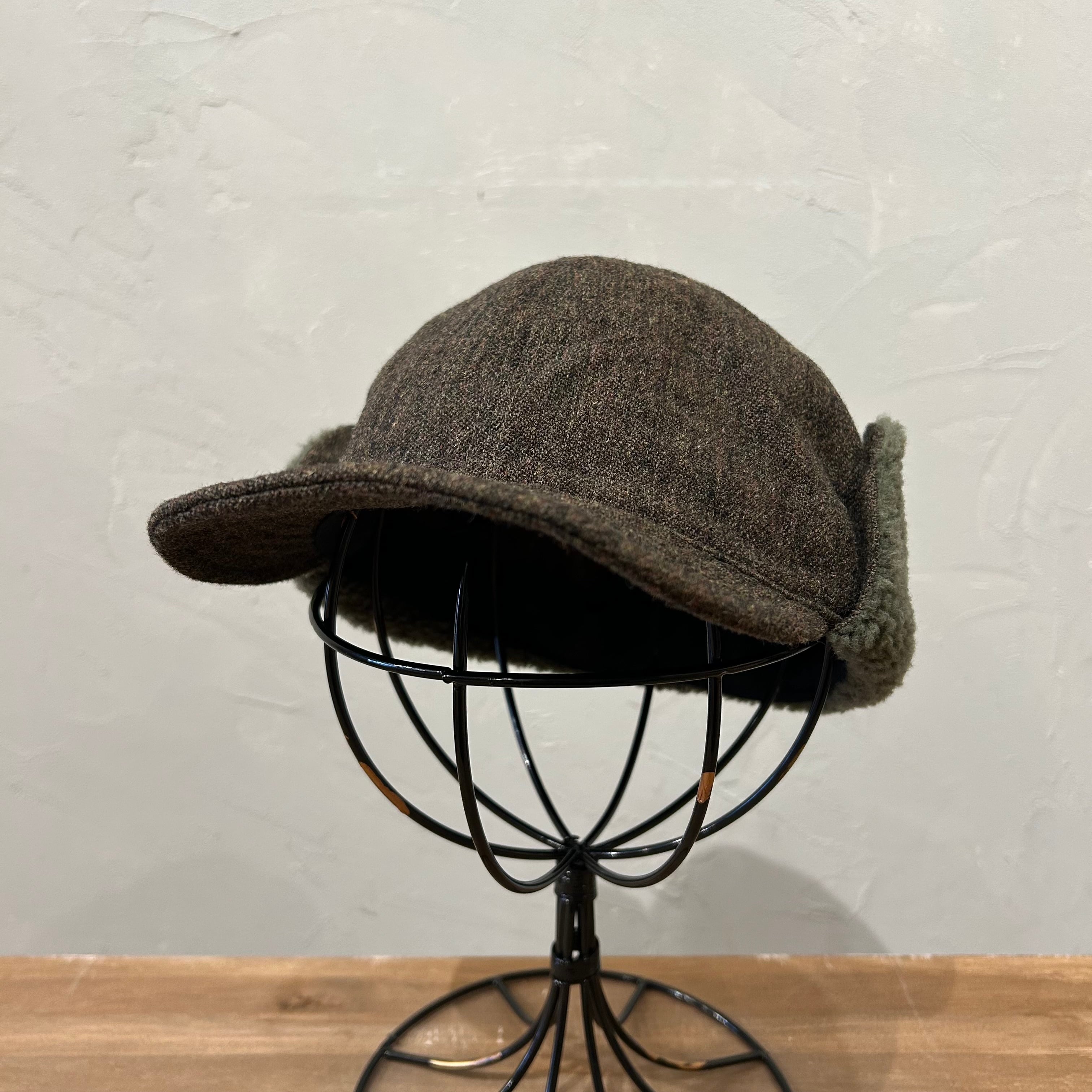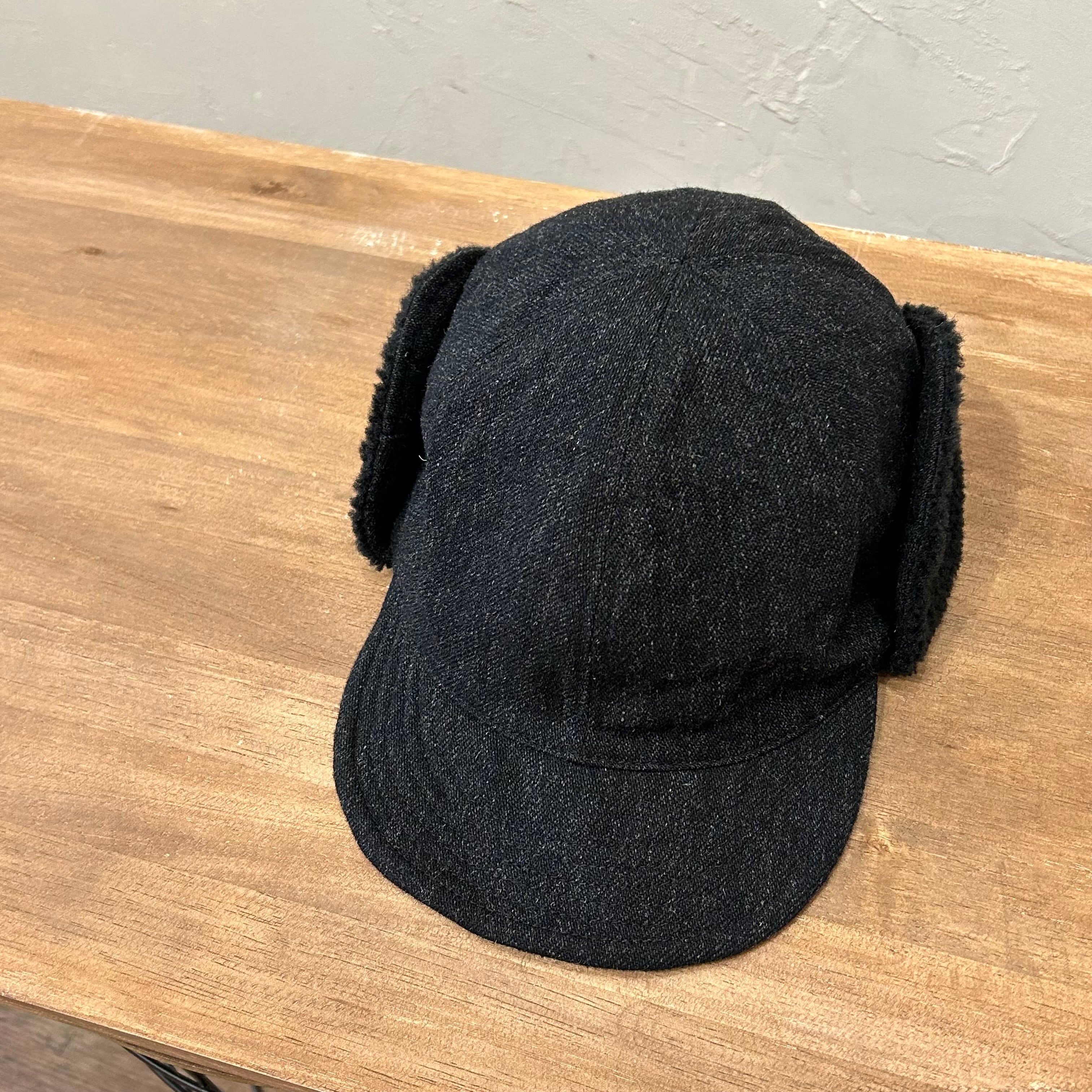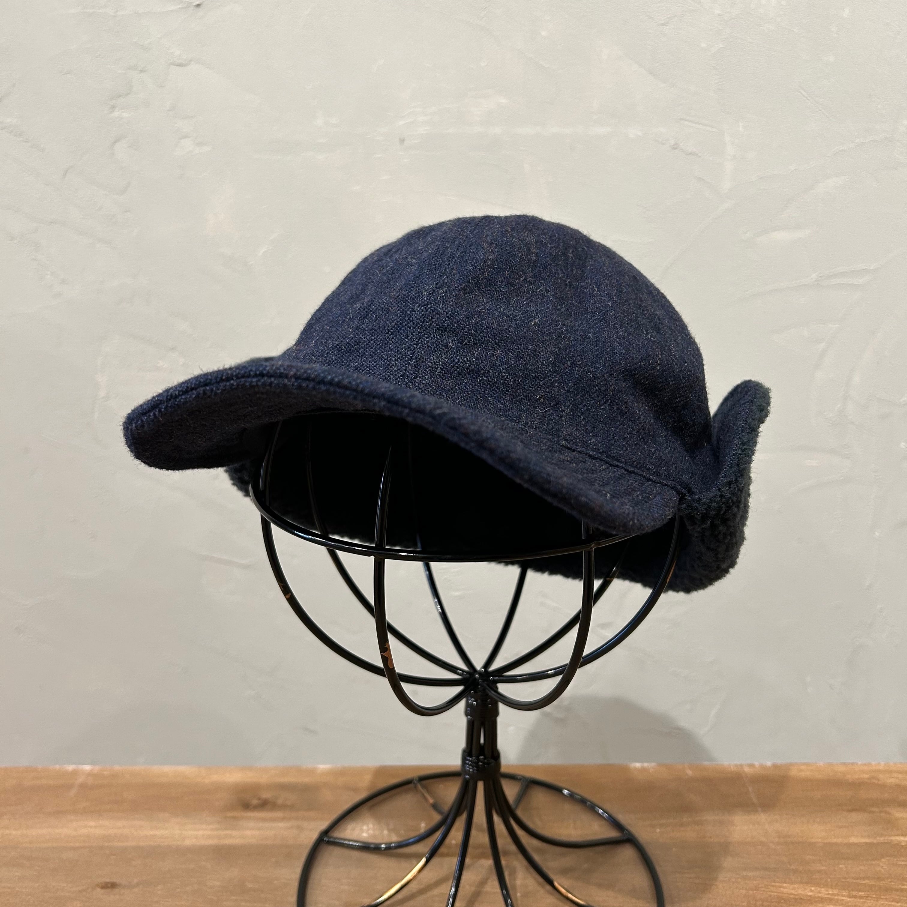 経糸をシェットランド混ウール、緯糸にデニムに使用される太番手のムラ糸を打ち込んだコットンウールツイル素材を使用したハンターキャップ。